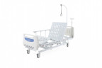 В комплектацию кровати входит также дуга для подтягивания и трансфузионная стойка. Это позволяет создавать максимально функциональное пространство для пациента и медицинского персонала. Кровать установлена на колесики, которые позволяют перемещать ее при необходимости транспортировки в другое отделение. Боковые ограждения кровати сделаны из алюминия.